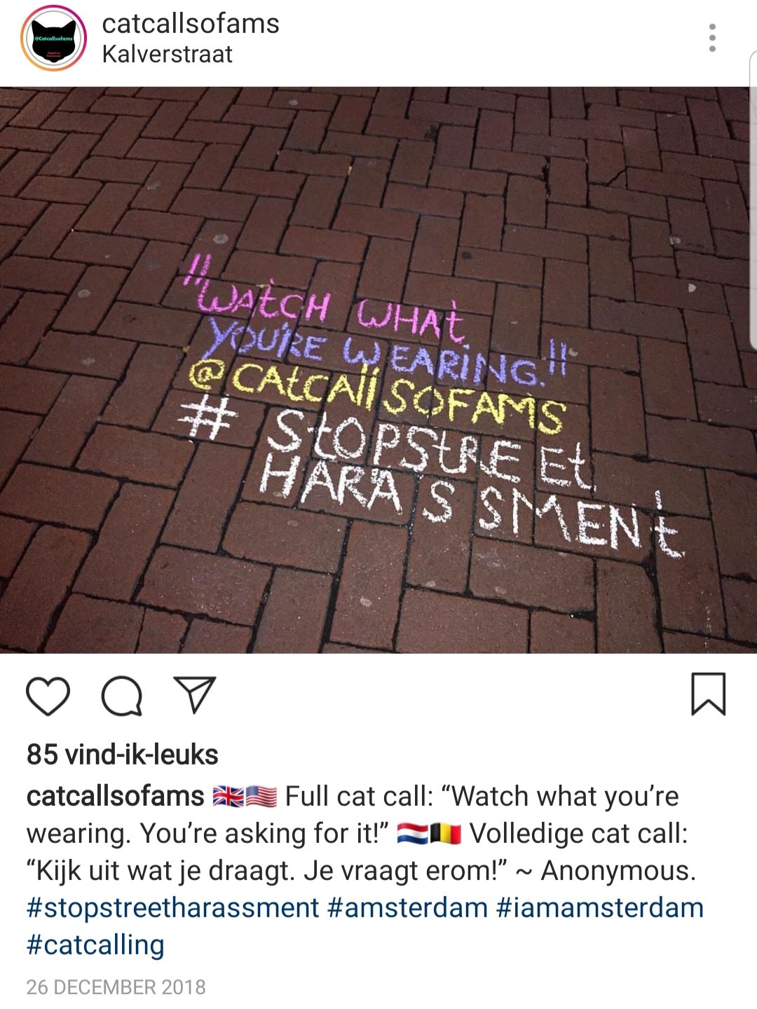 Ik las vanochtend een mooi artikel in Trouw. Het gaat over Ambrien Mouniralam, een meisje van 16 uit Amsterdam. Zij een andere meiden krijgen regelmatig intimiderende en seksueel getinte opmerkingen naar haar hoofd geslingerd. Ze schrijft ze met krijt op straat, daar waar het gebeurt en publiceert het op Instagram. Kijk zelf maar en zie hieronder een voorbeeld van een van haar posts. Zie hoe vaak het gebeurt! Ongelooflijk. Lees ook het artikel in Trouw (via Blendle) of een gratis artikel via oneworld. Overgenomen van @catcallsofams