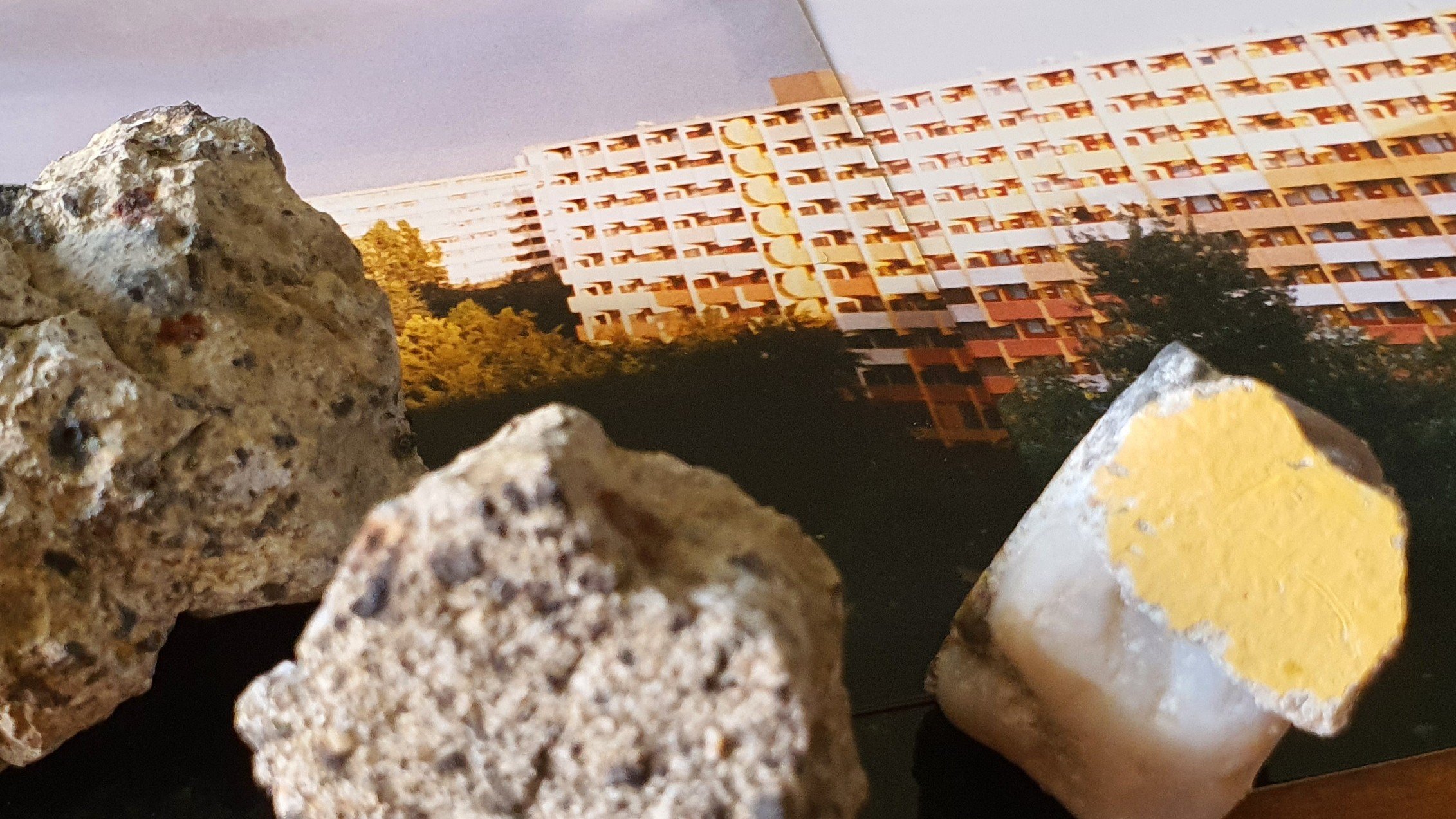 Ik nam een paar brokjes beton mee. Van onze flat. Ik stelde me voor: van ons huis. Een zoete herinnering voor later. Voor gisteren dus, toen ik even door mijn spullen ging.